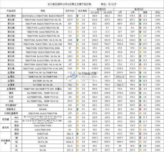 长三角区域年10月09日稀土主要产品价格