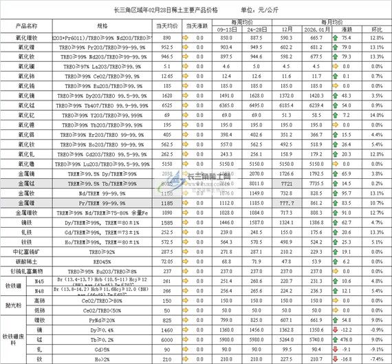 - · 长三角区域年02月28日稀土主要产品价格 2026-03-03 11:16:39