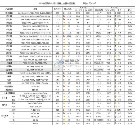 长三角区域年03月02日稀土主要产品价格