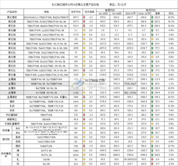 长三角区域年03月09日稀土主要产品价格