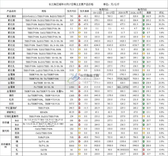长三角区域年03月17日稀土主要产品价格