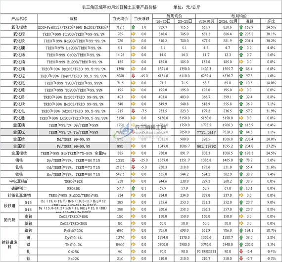 长三角区域年03月25日稀土主要产品价格
