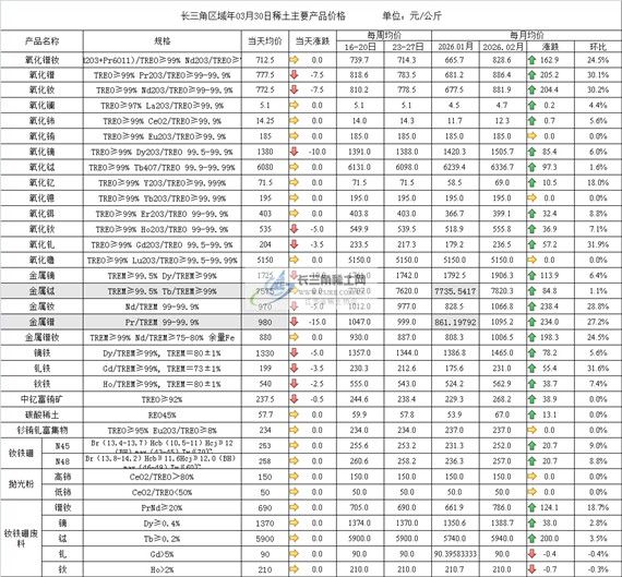 - · 长三角区域年03月27日稀土主要产品价格 2026-03-30 09:10:39