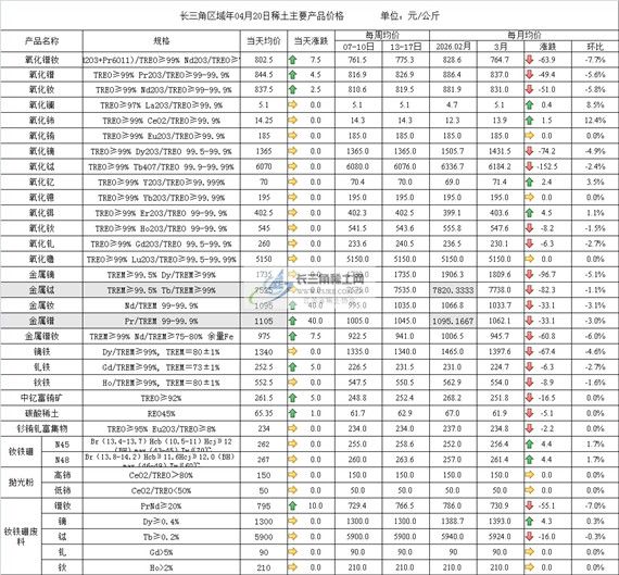 长三角区域年04月20日稀土主要产品价格
